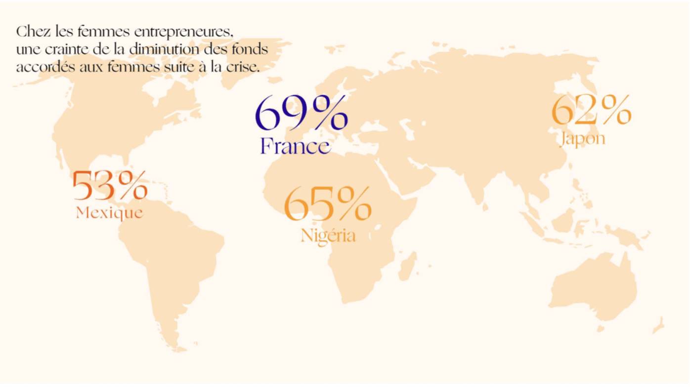 On observe une hausse importante de l’inquiétude des femmes face à leur capacité à trouver des financements pendant la crise du COVID. En effet, parmi les femmes entrepreneures, plus de la moitié craignent que la crise du COVID se traduise par une diminution des fonds accordés aux femmes. Cela est particulièrement vrai au Japon pour 62% des femmes entrepreneures, 64% au Mexique, 65% au Nigéria et 69% en France.