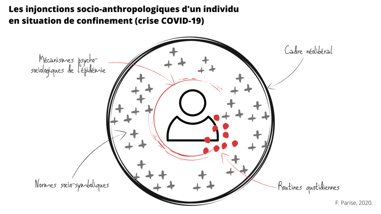 Entrevoir le confinement comme un phénomène social total permet de situer l’individu à travers les injonctions socio-anthropologiques avec lesquelles il doit composer au quotidien : de la sphère la plus intime à celle imposée par le contexte sociopolitique dans lequel il se situe.
