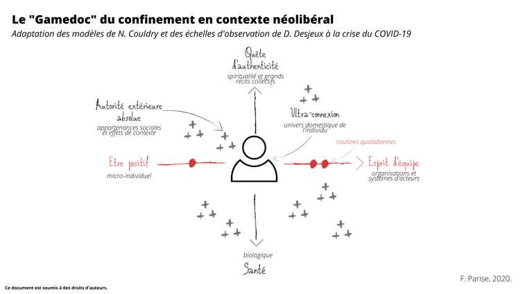 En ce sens, N. Couldry et P.-E. Reynolds se sont intéressés à la proximité entre le système néolibéral et la téléréalité d’enfermement de type « gamedoc ». Ce modèle nous fournit un cadre d’analyse propice à l’étude de l’individu, de son sociofuge et de ses déplacements hors-domicile. Les similitudes identifiées par les chercheurs entre ces deux univers permettent de mettre en exergue six variables avec lesquelles un individu doit composer en période de confinement :
