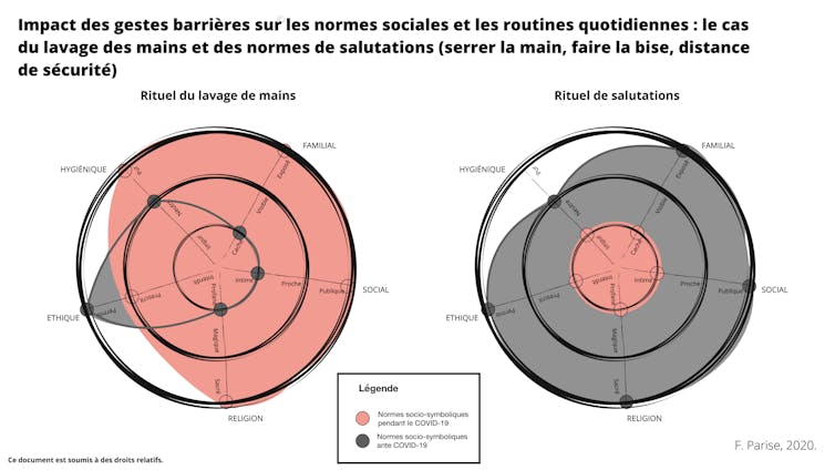 L’exemple de l’impact des gestes dits «barrières» sur les normes sociales et sur la dimension symbolique de certaines habitudes quotidiennes comme le rituel du lavage de mains ou ceux des salutations, rendent compte des changements de pratiques que les individus doivent mettre en place. Ces nouvelles injonctions viennent bousculer les certitudes et participent à une déstructuration du quotidien. La modélisation ci-dessus illustre le passage de la sphère personnelle à la sphère publique pour le premier rituel et à l’inverse pour le second, le passage de la sphère publique à la sphère personnelle et intime.